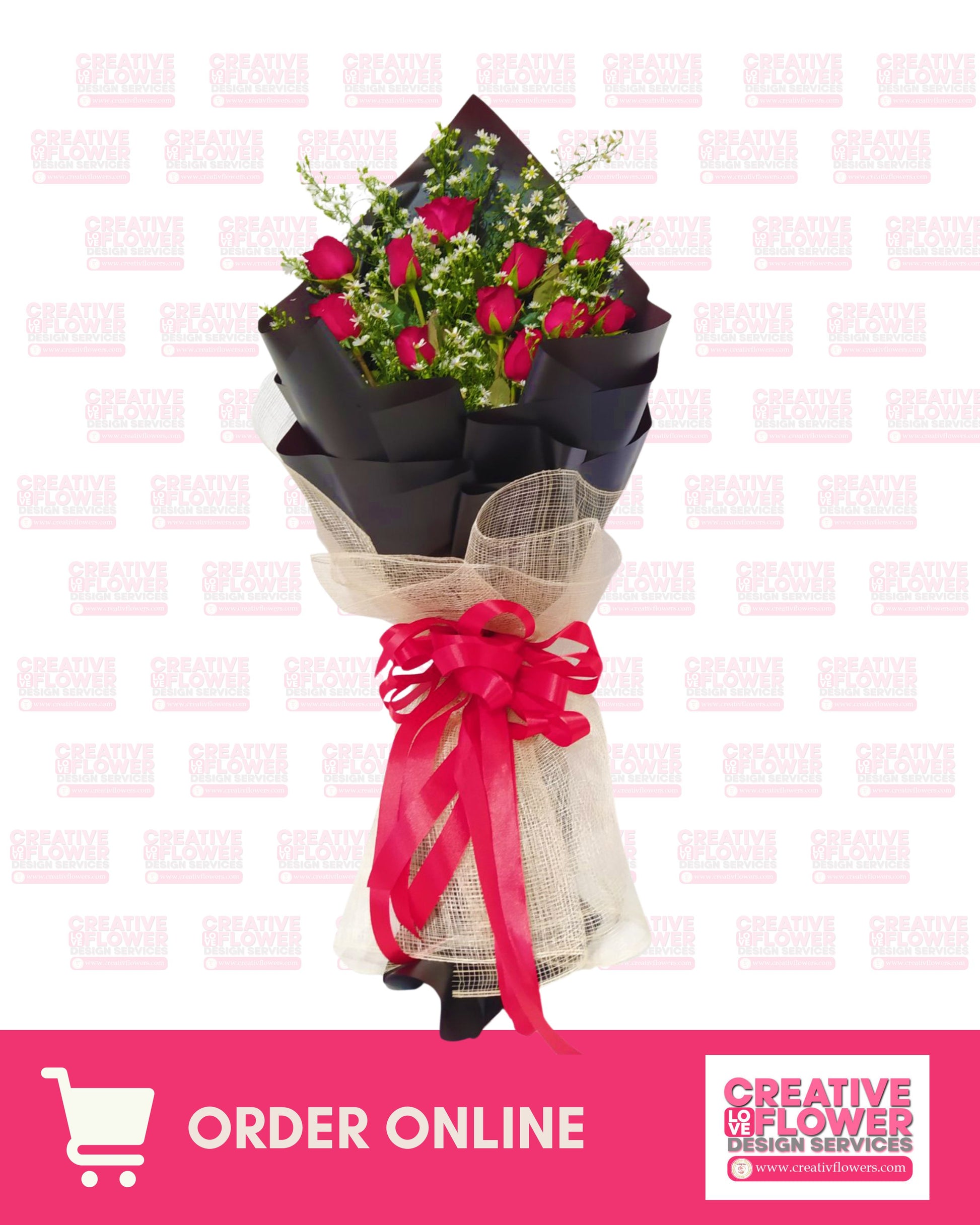 1 dozen of red roses in a black classic bouquet