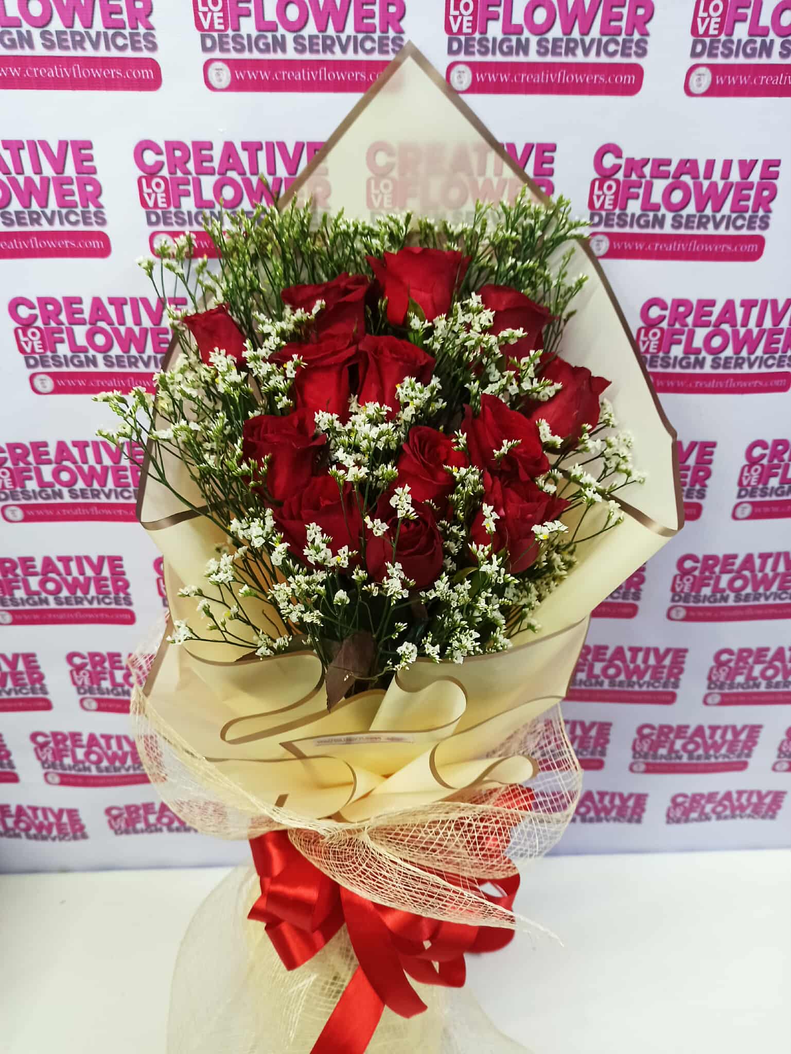1 dozen of red roses in a peach wrapper