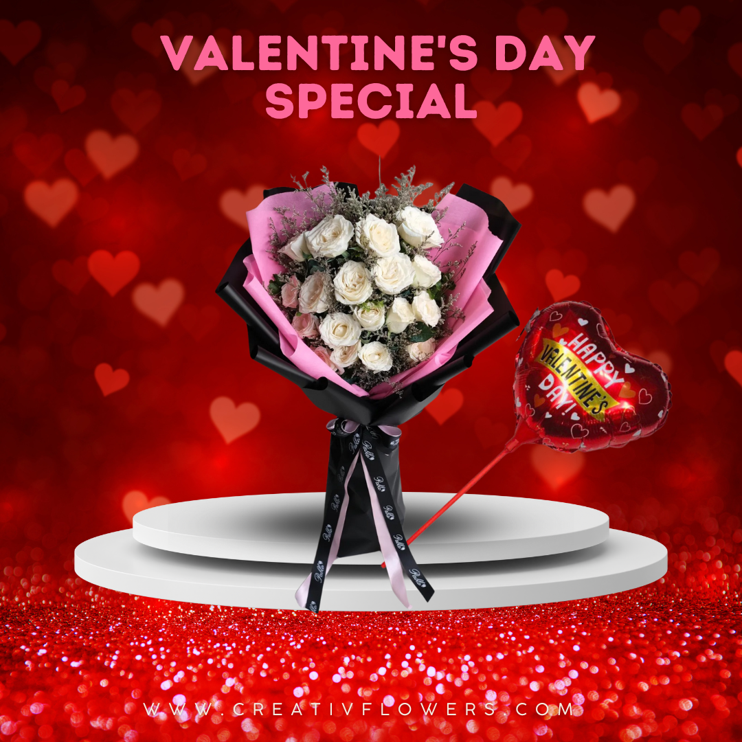 Wow your loved one with this playful bouquet of 18 white roses, wrapped in a unique combination of pink and black. Perfect for any occasion, these roses are sure to convey your love and affection in a fun and quirky way. Show them they're truly 18 and Loved!