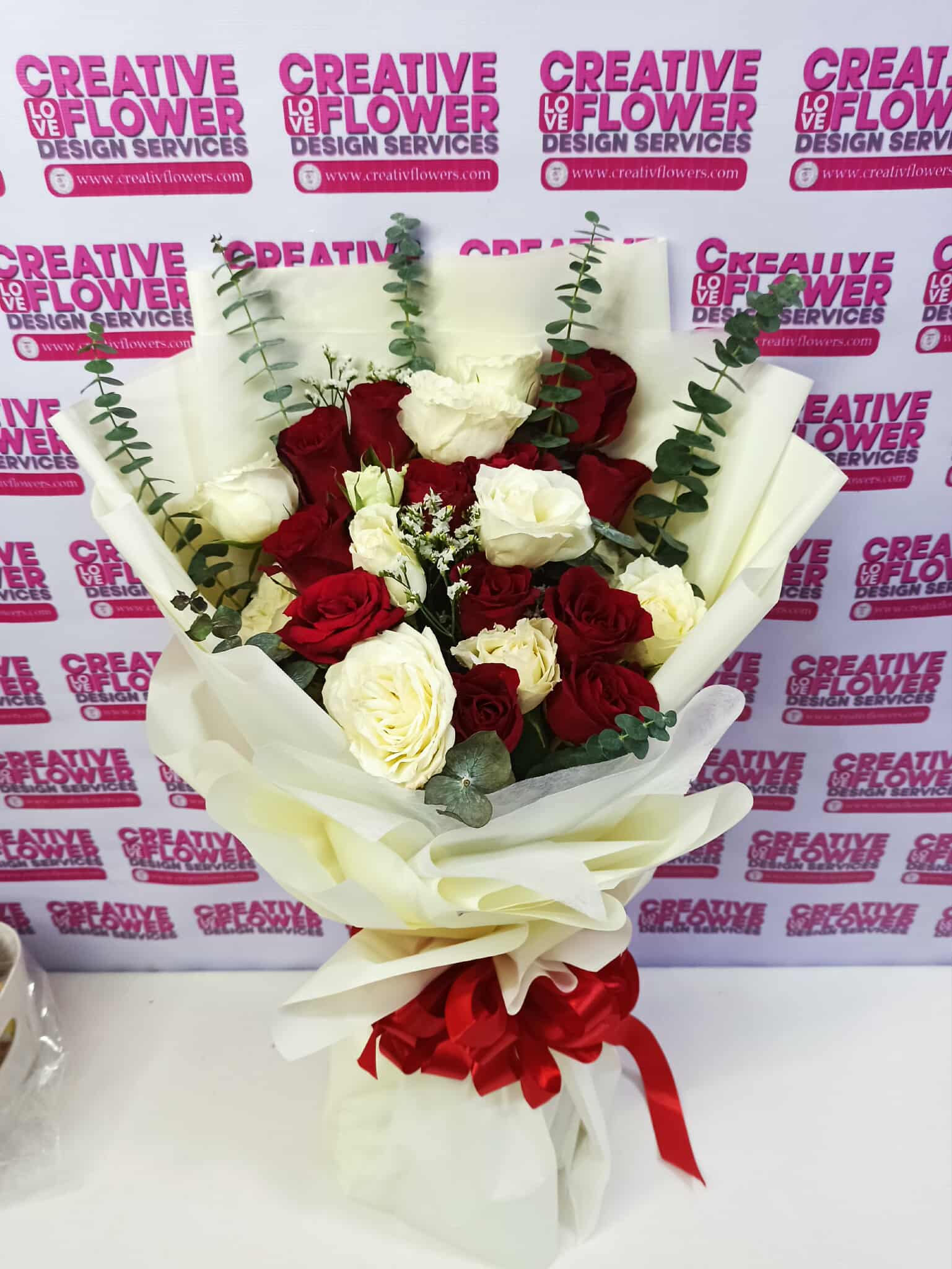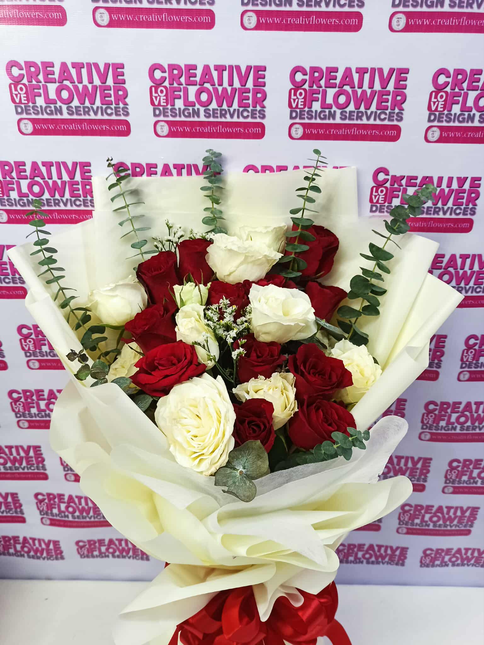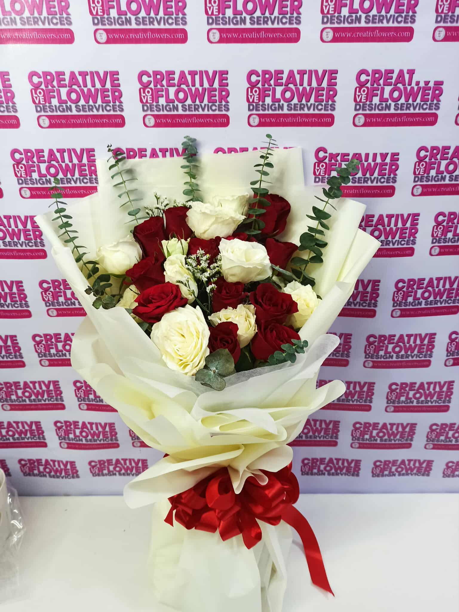 Expertly designed by our team, this bouquet features 2 dozen of beautiful white and red roses, accented with fragrant eucalyptus and delicate asther. Wrapped in a cream white wrapper, this elegant arrangement is sure to make a lasting impression. Perfect for showing your devotion to someone special.