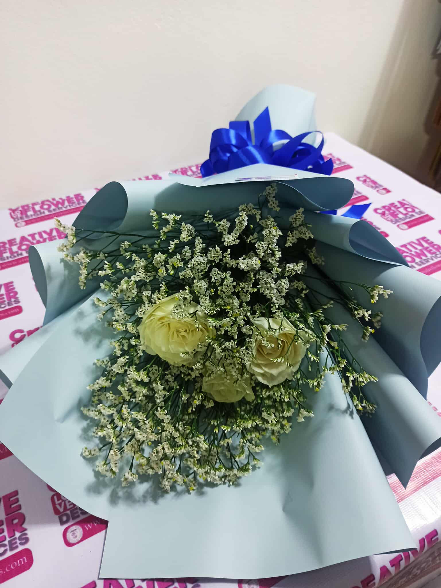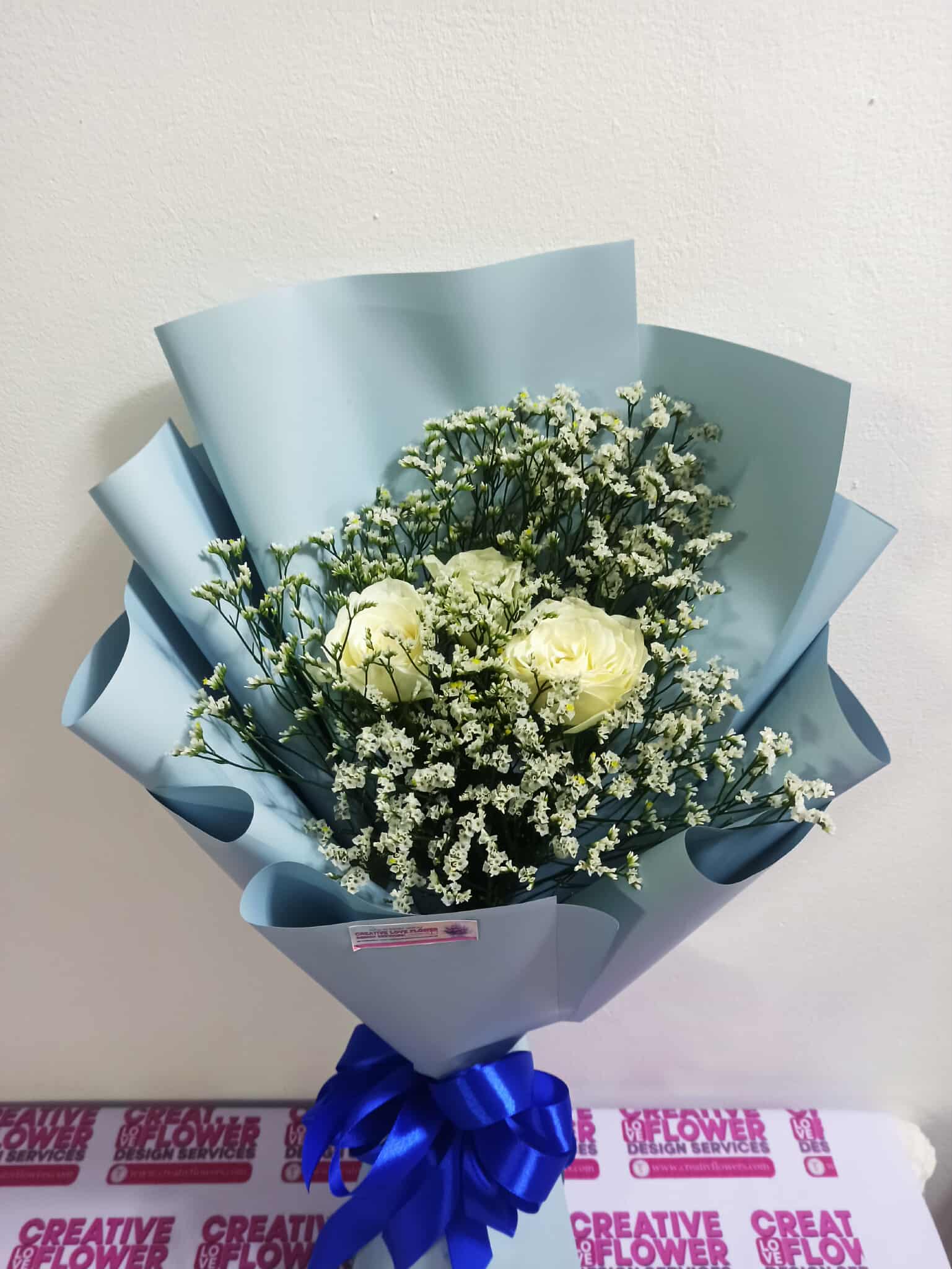 Elevate the atmosphere with 3 stems of Dashi White! Delicately bundled in a soothing baby blue wrap, these white roses add a touch of elegance to any space. Perfect for creating a tranquil and inviting ambiance in your home or office.