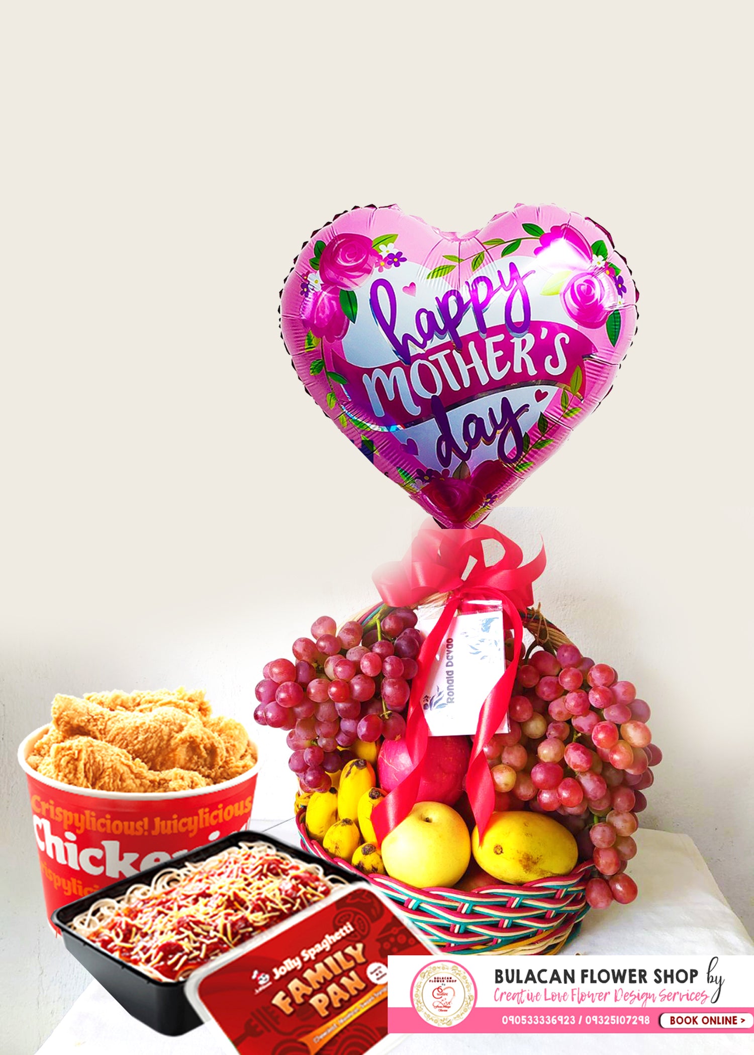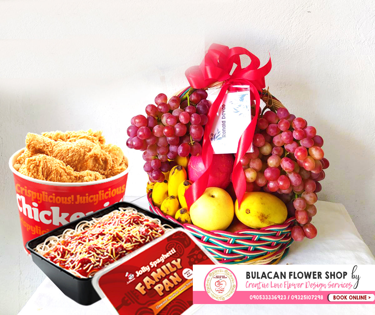 1 bucket of fried Chicken from Jollibee (6pcs) - 1 Family pan Spagetti