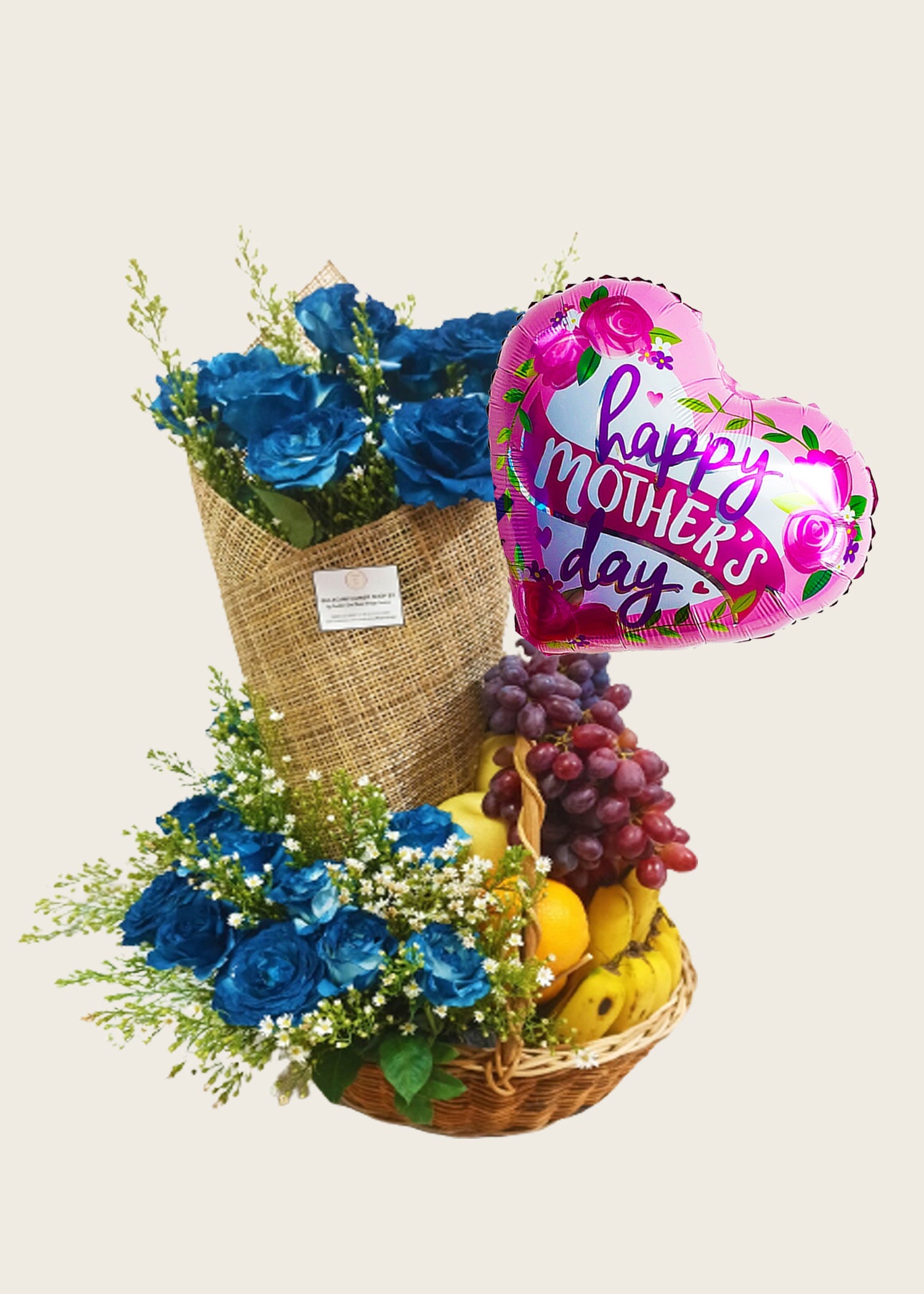 This Blue HUG Booster fruit basket consists of different varieties of fresh fruits such as grapes, bananas, mangoes, etc. paired up with 2 dozen blue spray roses in a half sided and cone arrangement is a crowd favorite!
