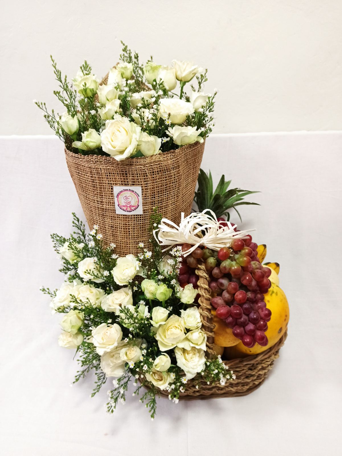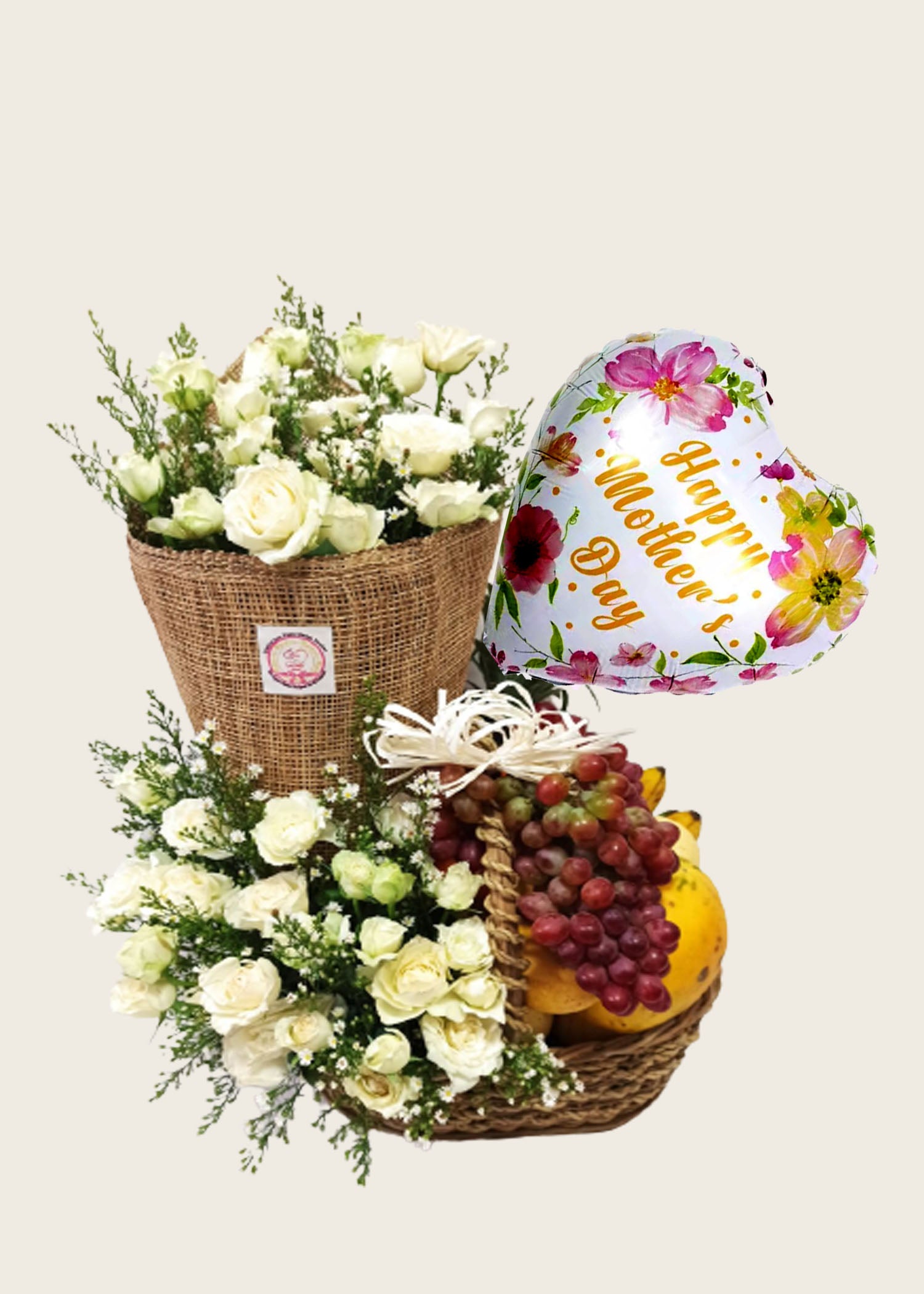 This Pure HUG Booster fruit basket consists of different varieties of fresh fruits such as grapes, bananas, mangoes, etc. paired up with 2 dozen white roses in a half sided and cone arrangement is a crowd favorite!