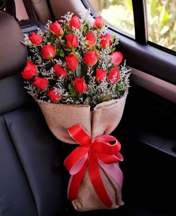 Conquer the unknown and take a chance with Misty 18! This daring bouquet features 18 vibrant red roses, locally sourced and carefully arranged in a natural wrap. The addition of misty blue fillers adds a touch of mystery to this bold and adventurous floral display.