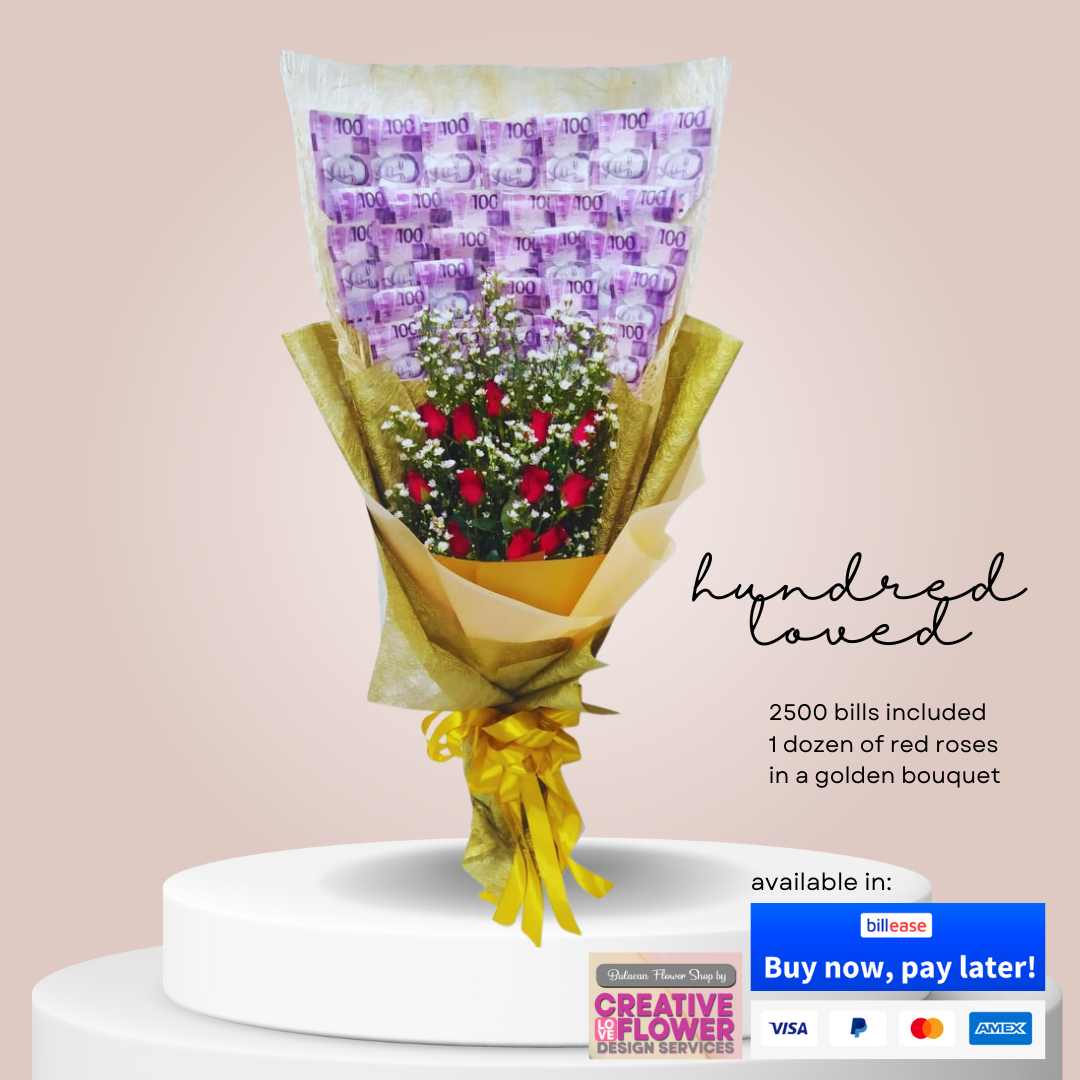 Our Money Bouquet - Hundred Loved provides a uniquely special way to express your feelings. This one-of-a-kind gift features a golden bouquet containing 1 dozen red roses and 2500 peso bills in denominations of 100. Send this thoughtful gesture to your loved ones to make sure your message is heard louder than words.