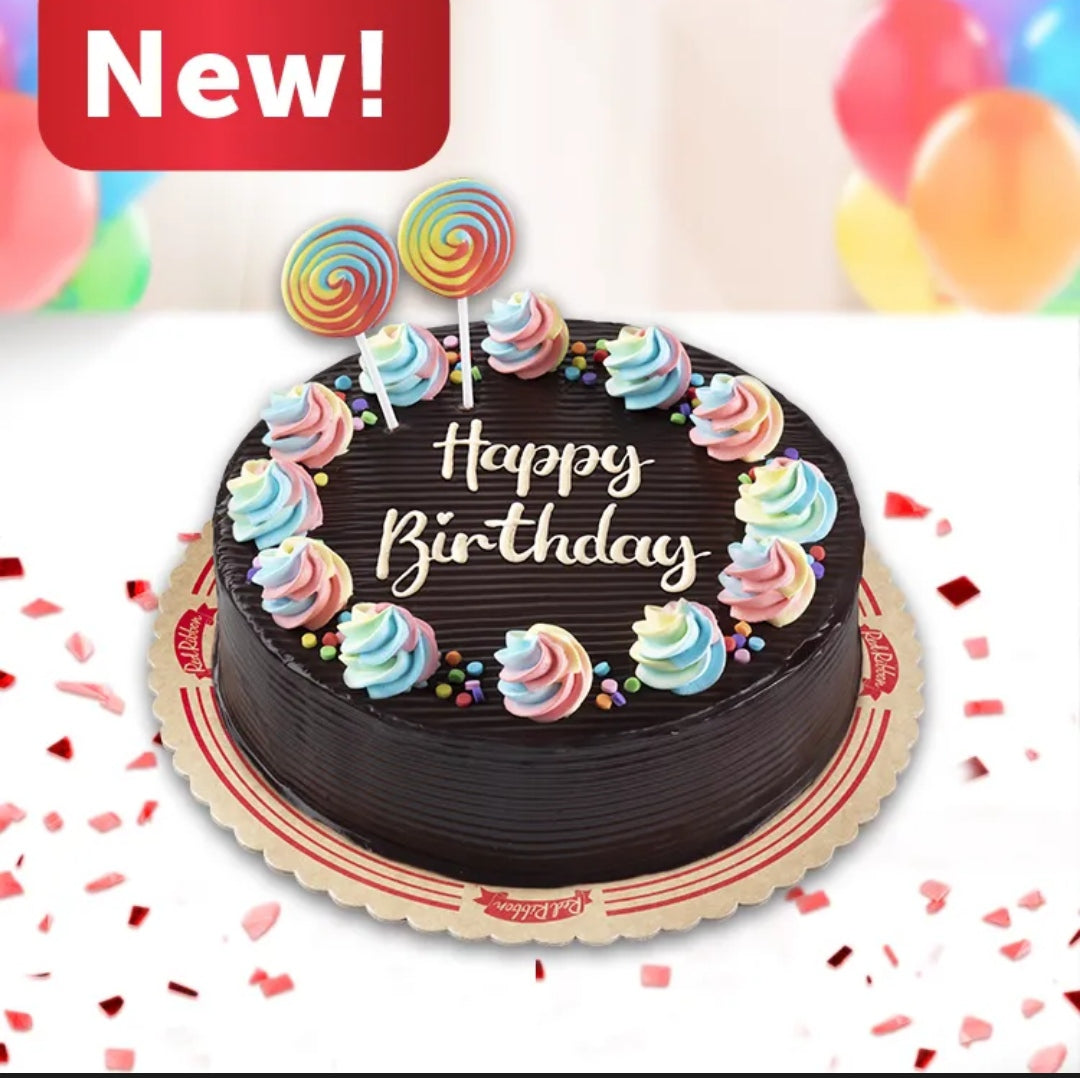 The ultimate kiddie birthday cake that’s colorful and chocolatey inside and out! It’s made up of colorful chocolate layers topped with chocolate rosettes, colorful sugar confetti, and lollipops. It can be personalized with your own special message.
