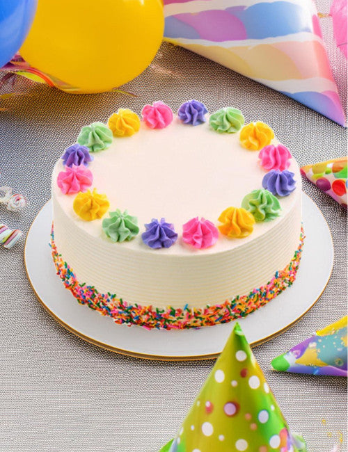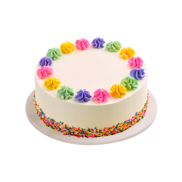 A rainbow explosion of yummy ube, strawberry, and vanilla flavors!Three-layers of ube, vanilla and strawberry chiffon cake filled with ube and strawberry buttercreme, covered with vanilla icing. Topped with rainbow colored rosette and more colorful with sprinkle.