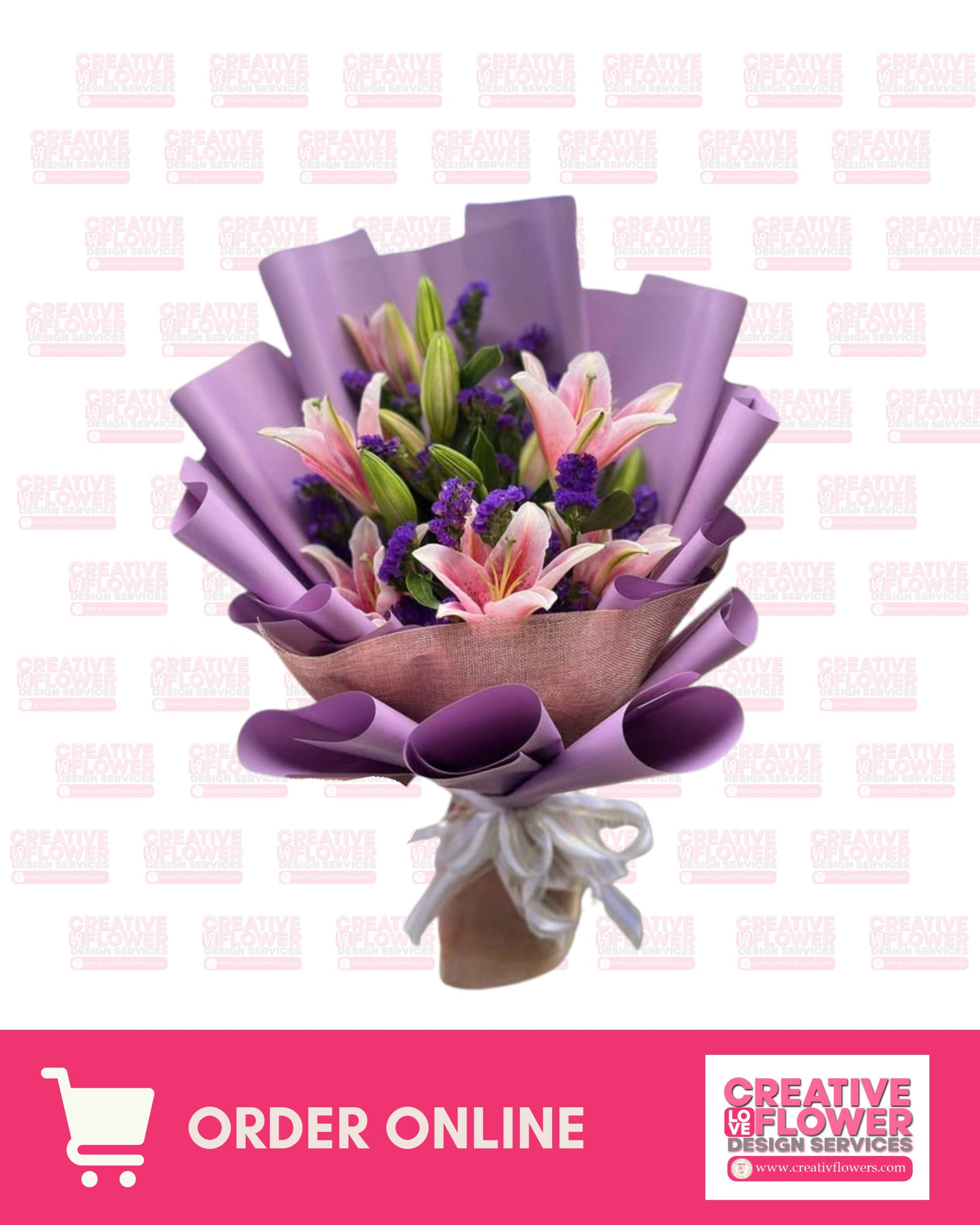 Stargazer lilies take center stage in this stunning purple bouquet, paired with delicate purple statice for added texture and charm. The bold, fragrant blooms create an impressive display that commands attention in any room. Perfect for celebrations, apologies, or simply brightening someone's day with nature's most dramatic flowers. Each arrangement is crafted to showcase the lilies' striking beauty and elegant presence.