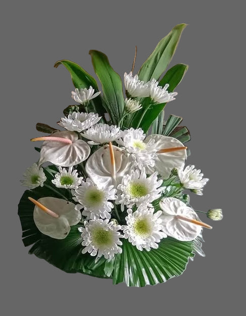 Celebrate Undas with a gentle arrangement of simple white rados and elegant anthuriums. This tasteful combination offers a quiet, respectful tribute that brings peace and beauty to your remembrance. Perfect for honoring loved ones with simplicity and grace.