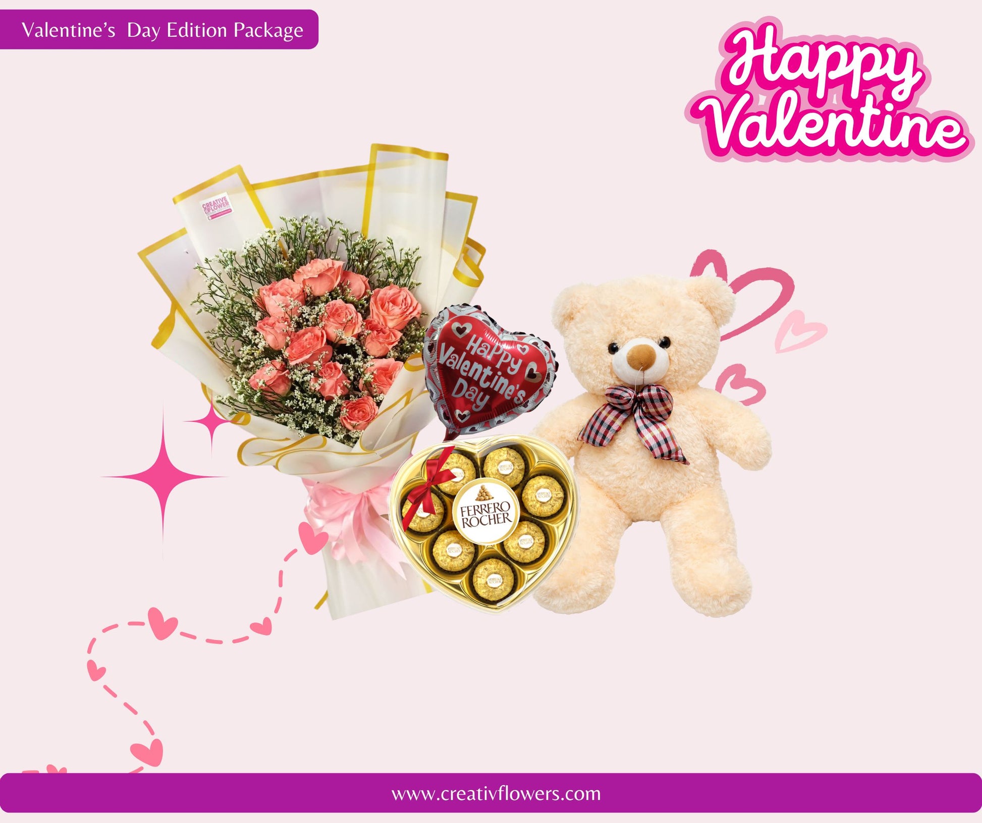 Celebrate love with this charming Valentine's bundle. A dozen orange roses wrapped in light wrapper creates an elegant centerpiece, complemented by a cuddly 2-foot tall pink plush teddy bear perfect for snuggling. Indulge together with a box of 8 Ferrero Rocher chocolates, and let your feelings shine with a 10-inch Happy Valentine's Day foil balloon. A personalized message card is included to express your heartfelt sentiments. The perfect gift to show someone special just how much they mean to you.